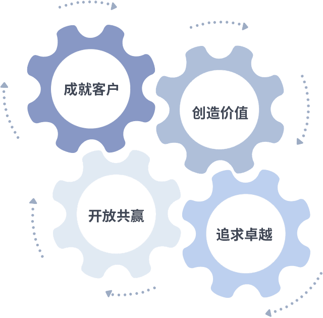 成就客户是一切决策的出发点,,,,创造价值是衡量所有工作的标准,,,追求卓越是js1996做事做人的态度,,,,开放共赢是js1996的格局也是最终的结果。。。。价值观的齿轮环环相扣,,推动着组织里的每个人不断向前。。